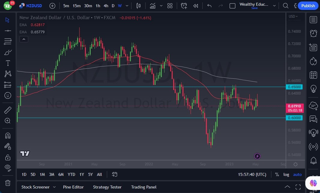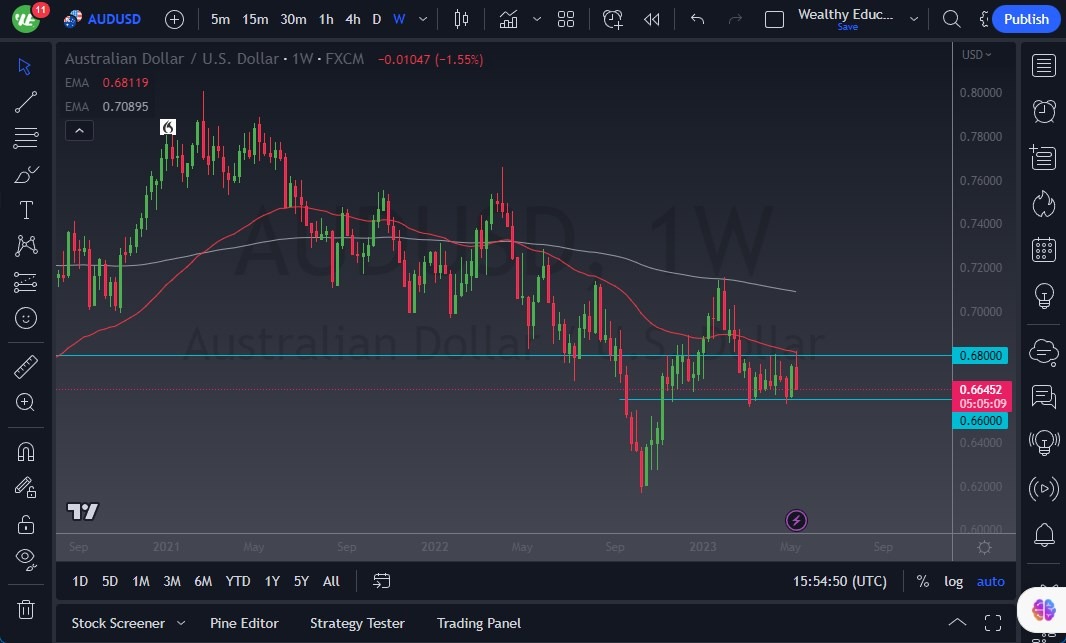 The Australian dollar initially tried to rally during the past week, but it touched the 50-week EMA and then fell rather precipitously. At this point, the 0.66 level will almost certainly be tested. If the Aussie breaks down below there on a daily close, it’s likely that it would continue to fall, perhaps reaching down to the 0.64 level.