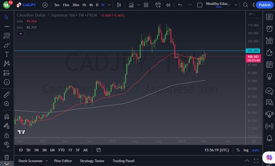 The Canadian dollar has fallen a bit against the Japanese yen to test the 50-week EMA, before turning around and showing signs of life. At this point, I believe that the JPY102.00 level is an area that should be closely monitored as it has been both significant support and significant resistance in the past.