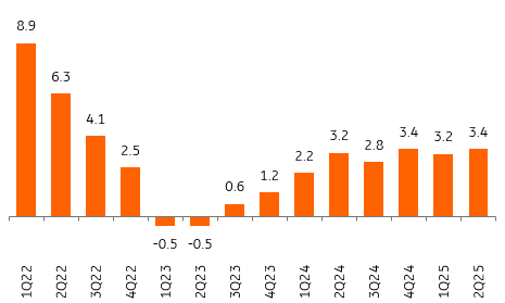 Poland’s GDP rose by 3.4% year-on-year (ING: 3.5%; consensus: 3.4%), according to the flash estimate, beating the 3.2%YoY growth posted in the previous quarter. Seasonally adjusted data indicate that the economy gained momentum as GDP rose by 0.8% quarter-on-quarter following the 0.7%QoQ rise in 1Q25.