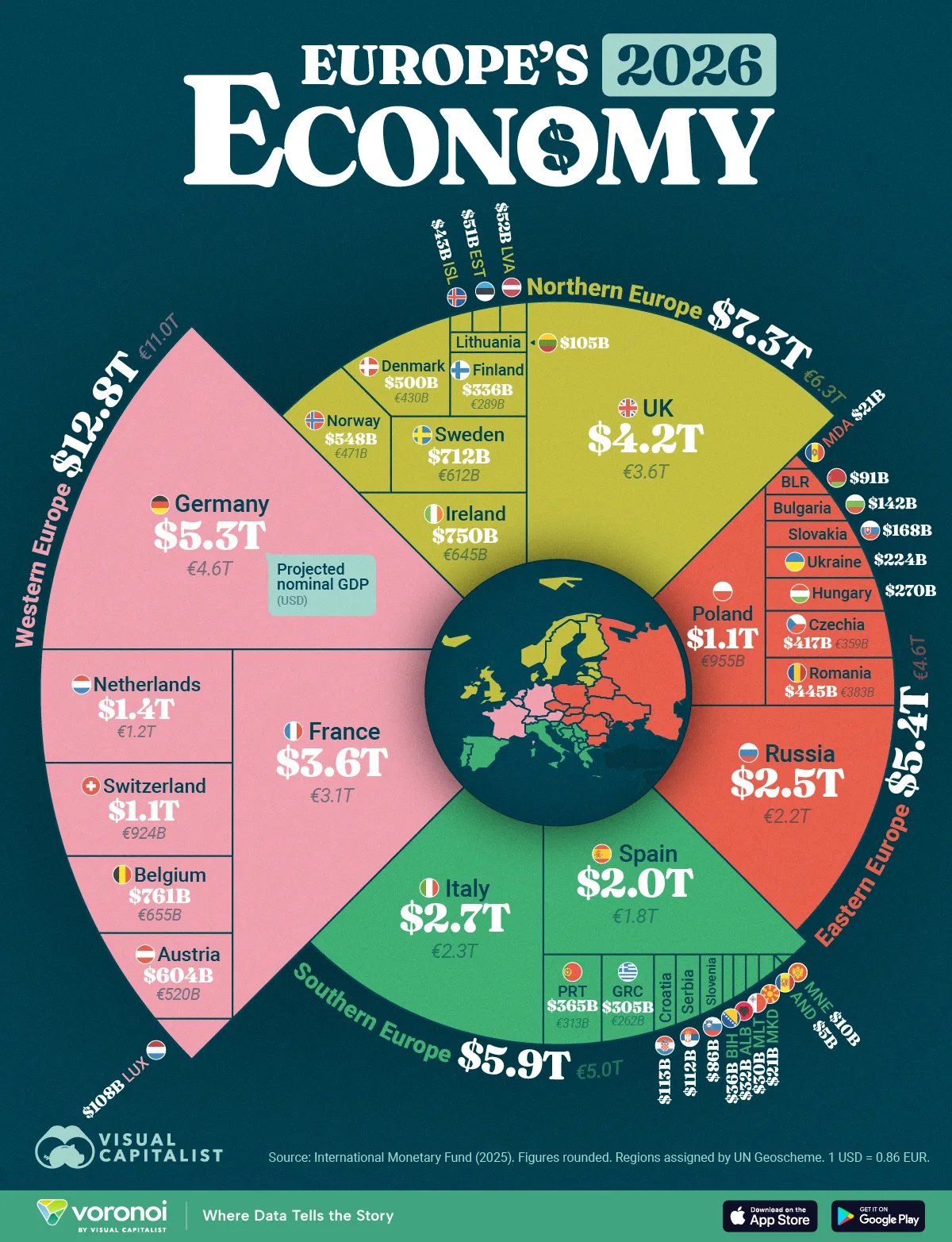- Western Europe continues to be the region’s largest economic bloc, generating about 40% of Europe’s projected $31 trillion (€27T) output in 2026.