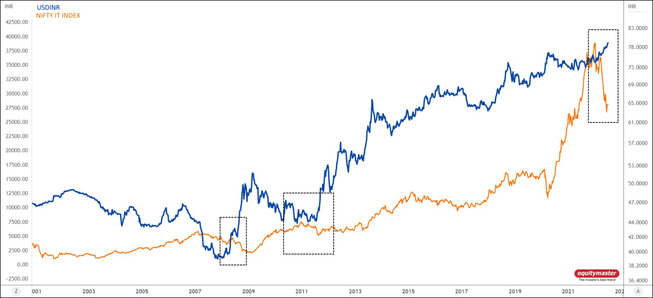 Historically, the USDINR and IT index stocks go hand-in-hand, though sometimes there are divergence considering the equity market scenario but the long-term relationship stays together.