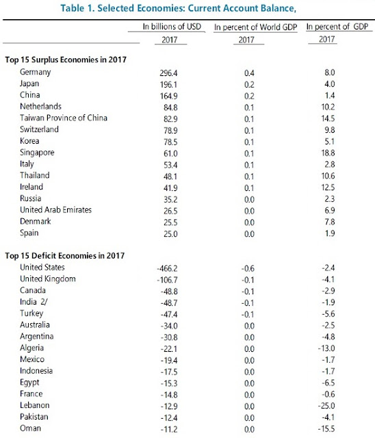 Here's a list of the 15 countries with the largest trade surpluses and deficits, as measured by the current account balance. It also shows these magnitudes as a share of world GDP and a share of the country's GDP (for the record, I've edited the table by cutting out the columns for 2014-2016).