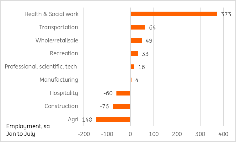 South Korea’s unemployment rate edged down to 2.5% in July, compared to 2.6% in June and market expectations. However, underlying indicators were less positive than the headline figure implies. The labour participation rate fell to 64.4%, marking its third consecutive monthly decline. Private sector hiring remained subdued. Manufacturing employment, meanwhile, decreased for the second month in a row. Construction has shed jobs in six of the past seven months in 2025. The sector is expected to be a significant drag on overall growth, with conditions potentially more challenging than we had previously thought.