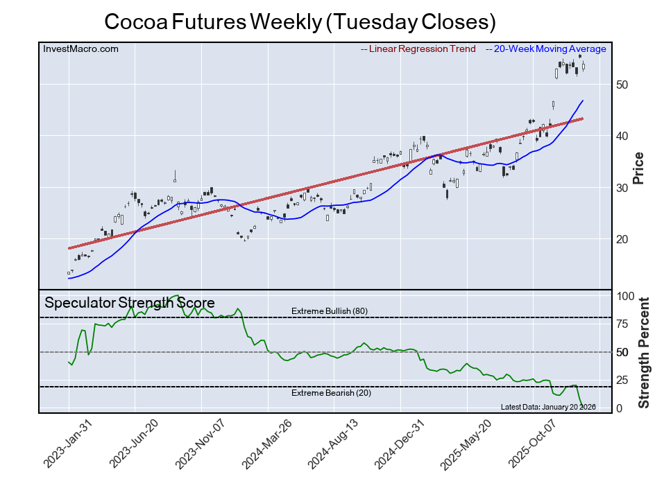 The cocoa futures speculator position came in tied as the most bearish extreme standing this week, as the speculator level is at a minimum 0% score of its three-year range. The six-week trend for the speculator strength score saw a decline of -14 percentage points this week.
