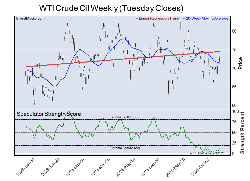 The WTI crude oil speculator positioning came in as the fifth most bearish extreme standing for this week. The speculator level is at just a 13% score of its three-year range. The six-week trend for the speculator strength score saw a rise of 7 percentage points this week.