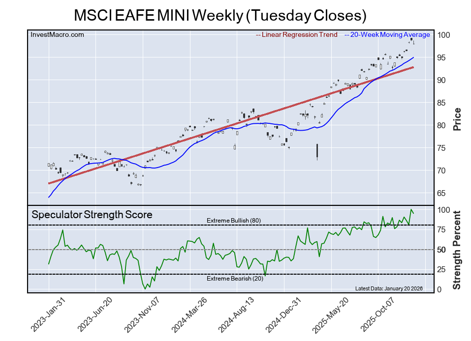 The MSCI EAFE Mini speculator positioning came in next in the extreme standings this week. The speculator level is also at a 95% score of its three-year range. The six-week trend for the speculator strength score increased by 8 percentage points this week.