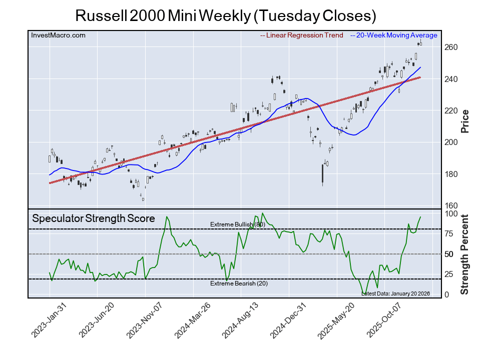 The Russell 2000 Mini speculator positioning came in third this week in the extreme standings, as the Russell speculator level resides at a 95% score of its three-year range. The six-week trend for the speculator strength score came in with a strong boost of 33 percentage points this week.