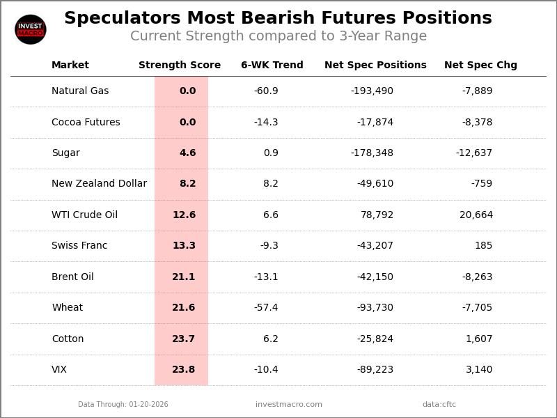 Next, here are the most bearish speculator positions of the week.