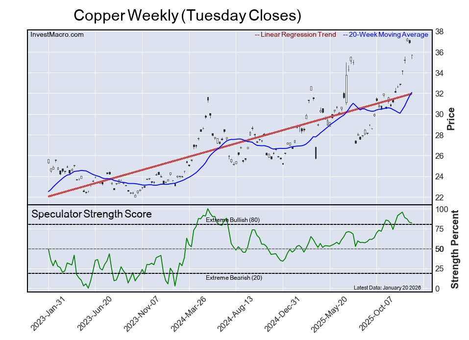 The copper speculator positioning rounded out the top five in this week’s bullish extreme standings, as the speculator level sits at an 82% score of its three-year range. The six-week trend for the speculator strength score saw a drop of -9 percentage points this week.