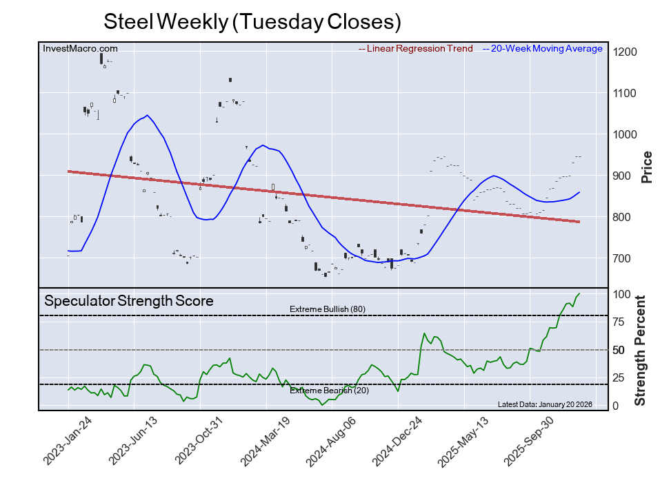The steel speculator positioning came in as the most bullish extreme standing this week, as the speculator level is currently at a maximum 100% score of its three-year range.
