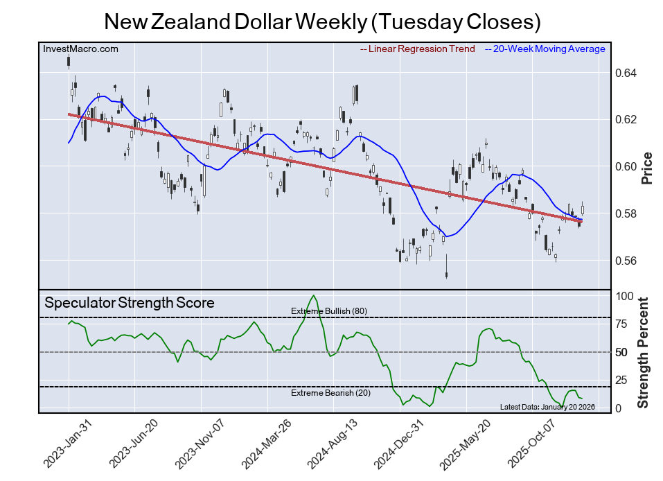 The New Zealand dollar speculator positioning came in as this week’s fourth most bearish extreme standing, with the speculator level sitting at an 8% score of its three-year range. The six-week trend for the speculator strength score saw a gain of 8 percentage points this week.