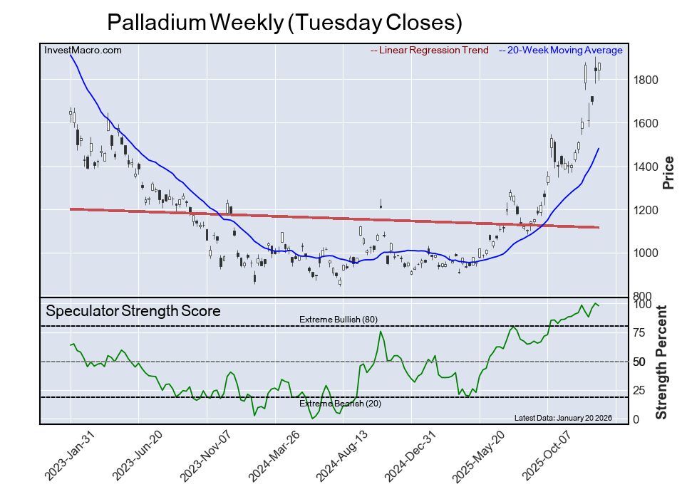 The palladium speculator position came up next in the extreme standings this week. The speculator level is now at a 98% score of its three-year range, while the six-week trend for the strength score saw a rise by 6 percentage points this week.
