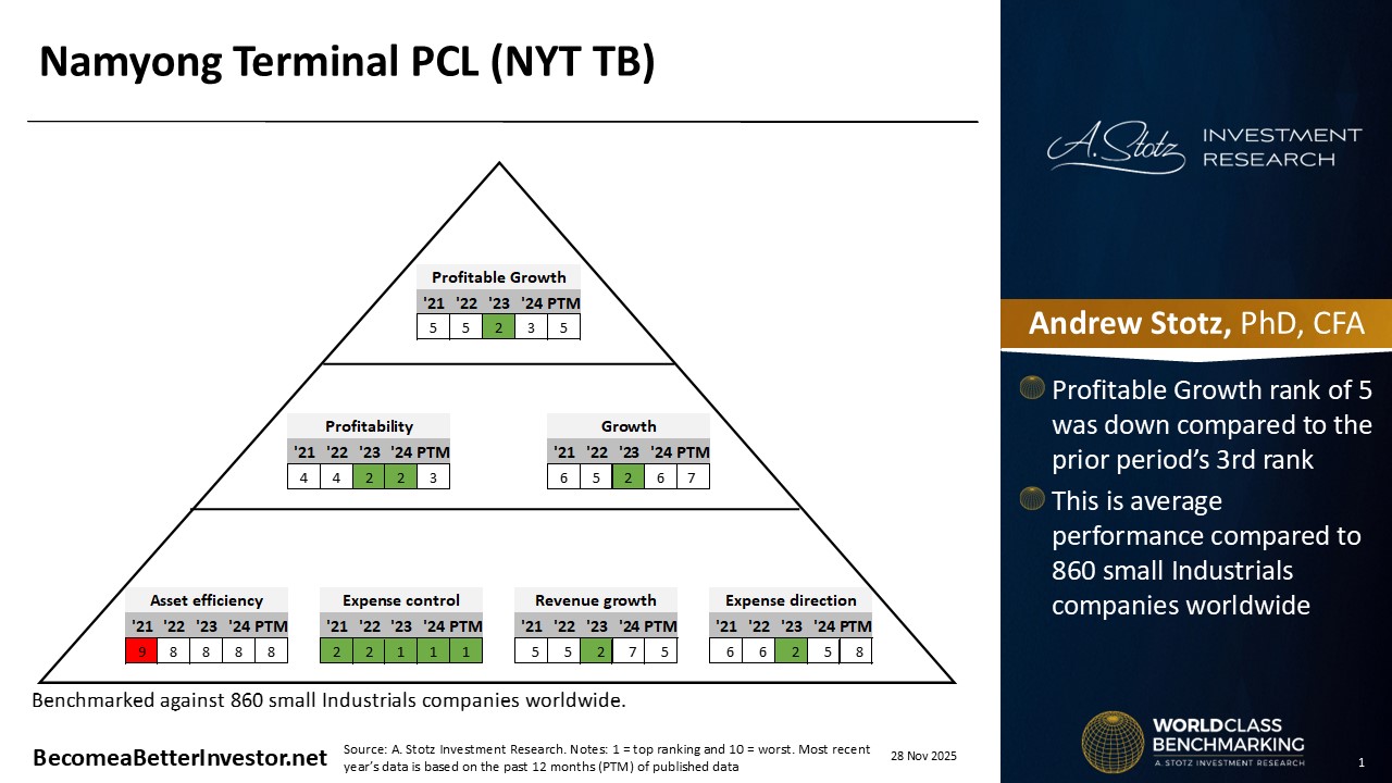 Background: Namyong Terminal Public Company Limited is a major port operator specializing in the Roll-on/Roll-off (Ro-Ro) vessel business in Laem Chabang, Thailand. Its core service is providing terminal handling and storage for new automobiles destined for export or import.