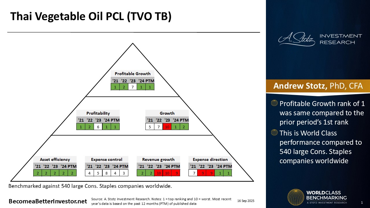 Background: Thai Vegetable Oil Public Company Limited is a producer and distributor of soybean meal and oil. The company operates four crushing facilities and three refineries in Thailand and exports its products to countries such as Singapore, Malaysia, Myanmar, and Cambodia.