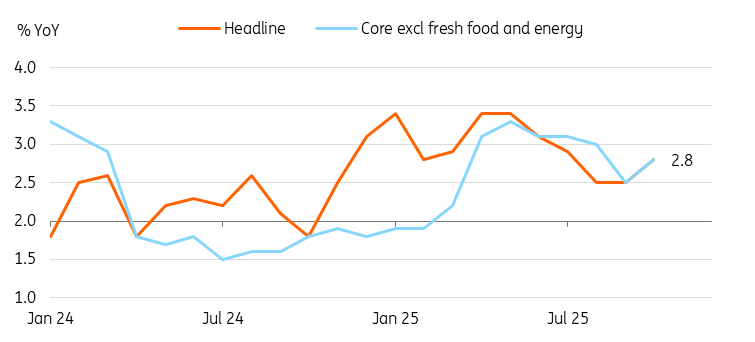 Tokyo CPI inflation increased 2.8% year-on-year in October (vs 2.5% in September, 2.4% market consensus). October is typically the month when companies adjust prices. A 0.6% month-on-month, seasonally adjusted, increase suggests businesses are raising final prices in response to input price hikes. Prices increased for both goods (0.9%) and services (0.4%), with notable gains in labour-intensive sectors like transport, communication, and entertainment.