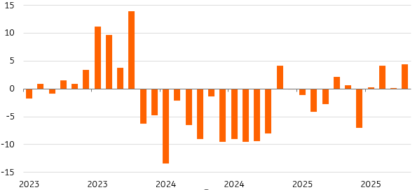 Construction output jumped up by 4.5% YoY after an increase of 0.2% YoY in the previous month. Double-digit growth in specialised works (23.0% YoY) and building construction (13.3% YoY) was accompanied by a drop in civil engineering (-7.2 YoY). The final quarter of 2025 saw construction activity bounce back after two consecutive quarters of annual declines. We expect a gradual recovery of this sector amid a surge in EU money (including the Recovery and Resilient Fund) and lower interest rates, but the beginning of 2026 may be difficult due to harsh weather conditions (frost and heavy snowfall).
