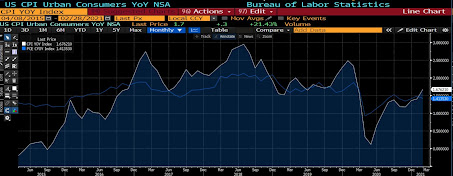 Remember, the Fed targets the headline PCE deflator, though it talks about the core rate. The March readings are not due until the end of April. Here, the Bloomberg chart shows the headline CPI (white line) and headline PCE deflator (blue line). The latter is more stable than the former. The PCE deflator tends to run below CPI, but there are exceptions. Fed officials say they will look through the base effect boost in inflation. The Fed is preserving its strategic ambiguity and has yet to define the look-back period for calculating the average rate of inflation.