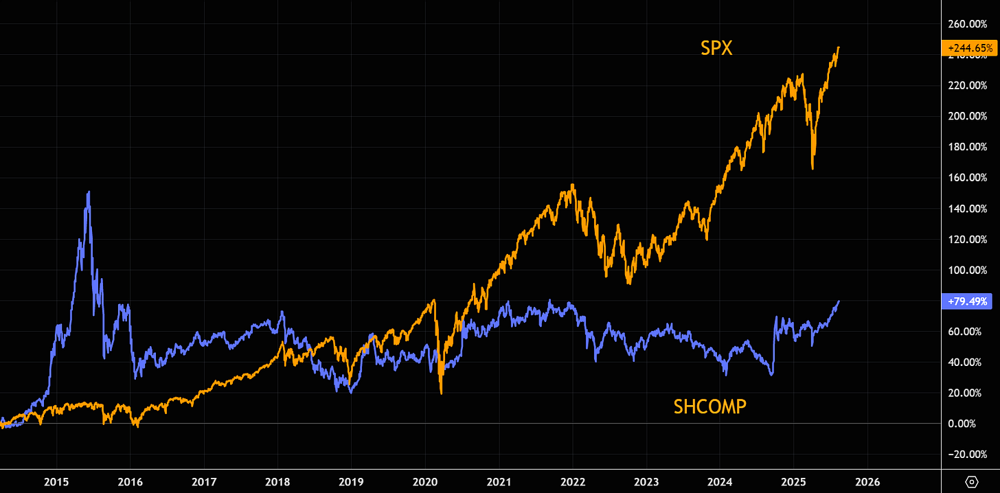 But zoom out, and the bigger picture still matters. The SHCOMP remains miles under its 2015 peak. Stack that against the S&P, which has ripped over 250% in the same timeframe, and the relative underperformance jumps off the chart. It screams “catch-up potential,” but Friday’s gnarly data dump was a reminder not to confuse tactical juice with a clean structural turn. There’s room to run, sure — but it’s a trade you size with the handbrake still on.