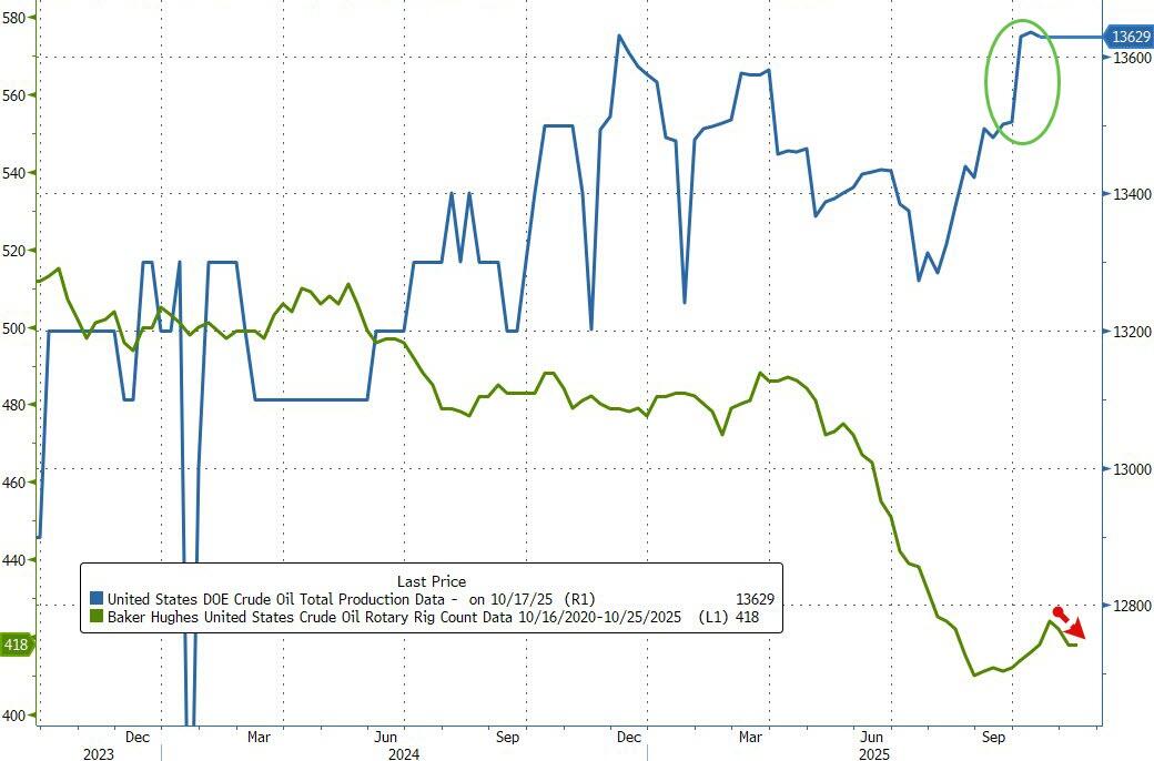 US crude production hovered near record highs (as the rig count started to decline again)...