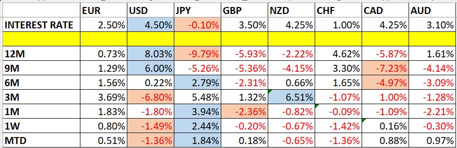 Let us look at the relevant data of currency price changes and interest rates to date, which we compiled using a trade-weighted index of the major global currencies: