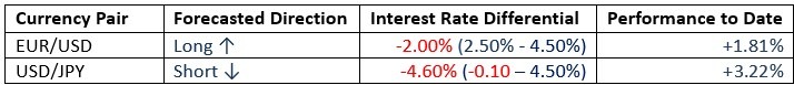 For the month of January, I forecasted that the EUR/USD currency pair would rise in value and that the USD/JPY currency pair would fall in value.