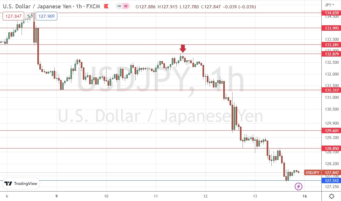 I had expected the level at ¥132.90 might act as support in the USD/JPY currency pair last week, as it had acted previously as both support and resistance. Note how these “role reversal” levels can work well. The H1 price chart below shows how although the level was not quite reached, the price rejected the weekly high just 3 pips below that level right at the start of last Wednesday’s New York session (which can often be a great time to enter Forex trades involving the major currency pairs like this one) with a small inside candlestick, marked by the down arrow signaling the timing of this bearish rejection. This trade would have been extremely profitable, achieving a maximum positive reward to risk ratio of more than 12 to 1 so far based on the size of the entry candlestick structure.