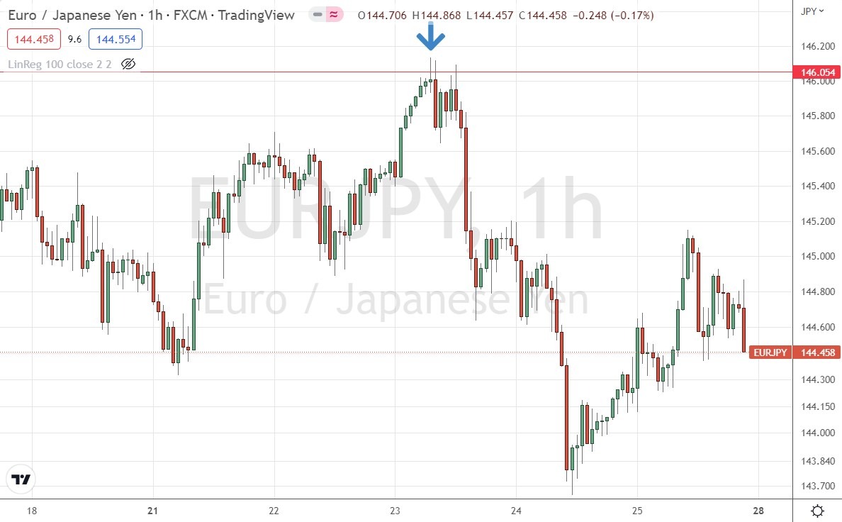 The H1 price chart below shows how the price rejected this level right at the end of last Wednesday’s Tokyo session (which can often be a great time to enter Forex trades in the Japanese yen) with a bearish inverse hammer/shooting star candlestick, marked by the downward arrow which signals the timing of this bearish rejection.