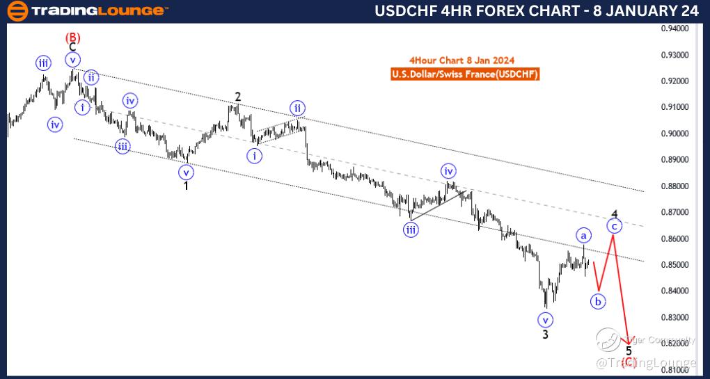 The "USDCHF Elliott Wave Analysis Trading Lounge 4 Hour Chart" dated 8 January 24, provides a detailed examination of the U.S. Dollar/Swiss Franc (USDCHF) currency pair using Elliott Wave analysis. This analysis aims to assist traders in understanding the current market dynamics and predicting potential future movements.