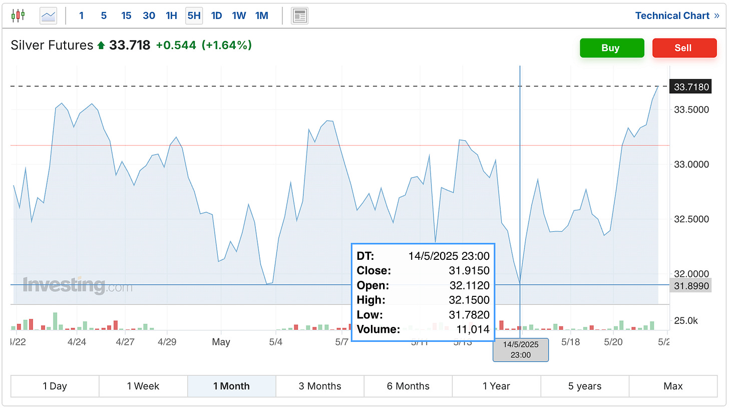 The silver futures were up another 54 cents today to $33.17, with silver's recent low being $31.78 on May 14.