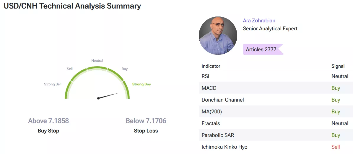 The technical analysis of the USDCNH price chart on 4-hour timeframe shows USDCNH,H4 is advancing above the 200-period moving average MA(200) after breaching below the MA(200) and then returning above it yesterday. We believe the bullish movement will continue after the price breaches above the upper bound of the Donchian channel at 7.1858. A level above this can be used as an entry point for placing a pending order to buy. The stop loss can be placed below 7.1706. After placing the order, the stop loss is to be moved to the next fractal low indicator, following Parabolic signals. Thus, we are changing the expected profit/loss ratio to the breakeven point. If the price meets the stop loss level without reaching the order, we recommend cancelling the order: the market has undergone internal changes which were not taken into account.