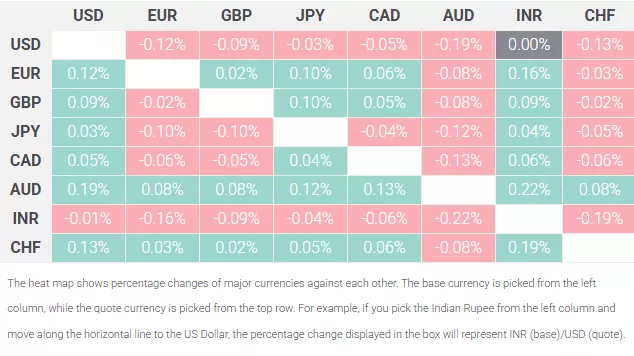 The table below shows the percentage change of Indian Rupee (INR) against listed major currencies today. Indian Rupee was the strongest against the US Dollar.