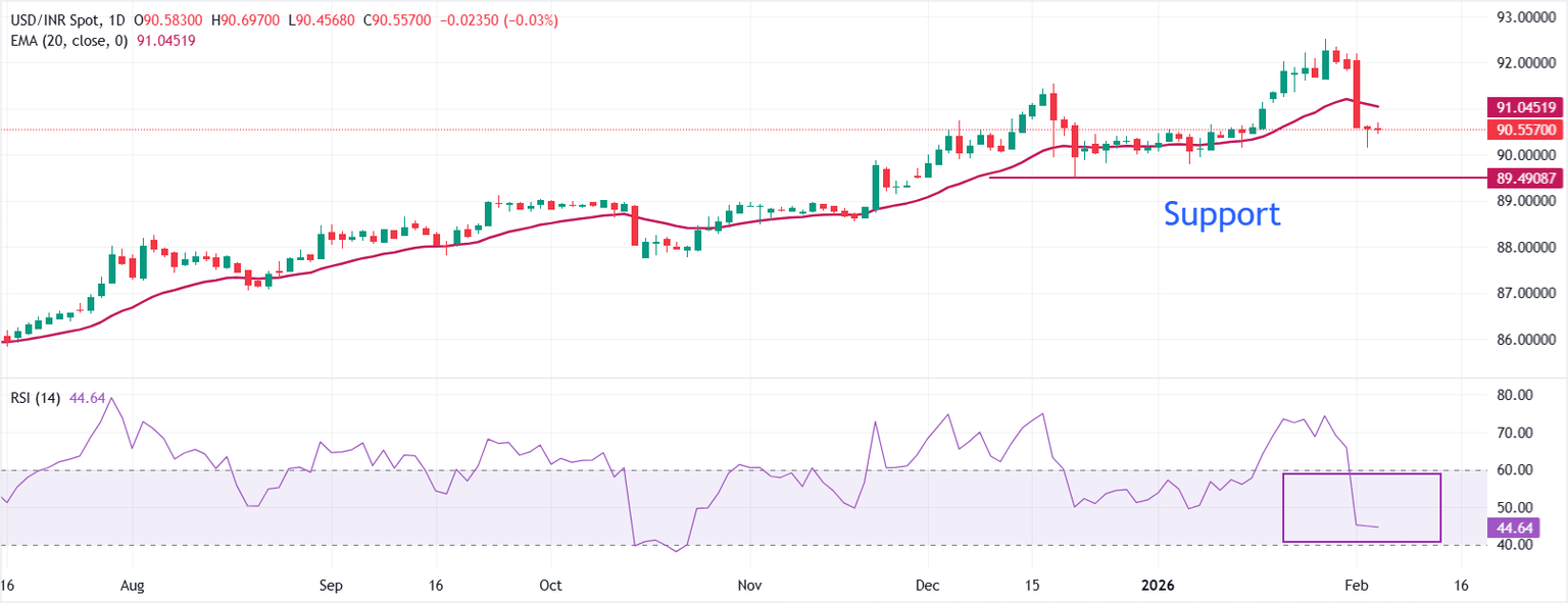 In the daily chart, USD/INR trades at 90.5715. Price holds below the 20-day exponential moving average at 91.0466, which slopes lower and caps rebound attempts. The declining average keeps the near-term trend tilted lower. RSI at 44.82 (neutral) slips beneath the midline, confirming waning upside momentum.