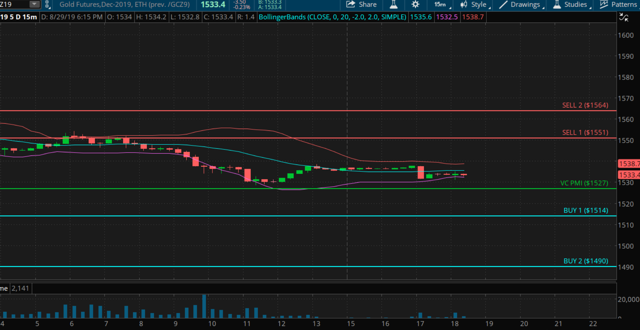 As we look at the December gold contract with the weekly Variable Changing Price Momentum Indicator (VC PMI) indicators, it is clear on the chart that the Sell 2 (S2) level is $1,564. The market made a high of $1,565 on the 25th of August at 3:15 pm (Pacific Time). Since then, the market has reverted back down below the Sell 1 (S1) level of $1,551. It has traded around that level until we saw the market break down decisively on the 29th of August at about 6:30 am, activating a trigger point on a close below $1,551.