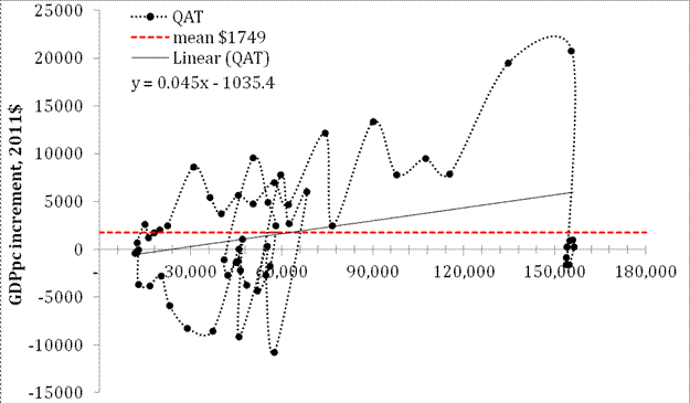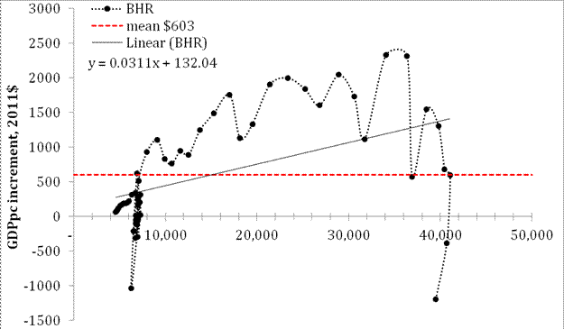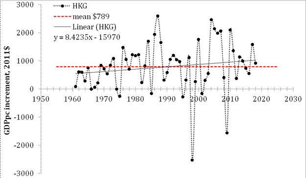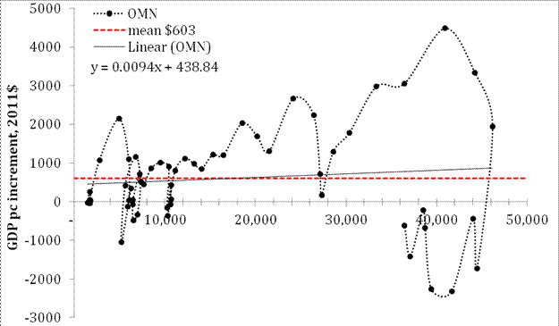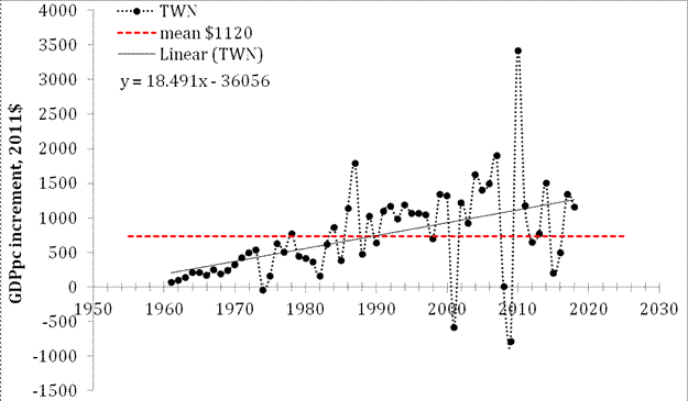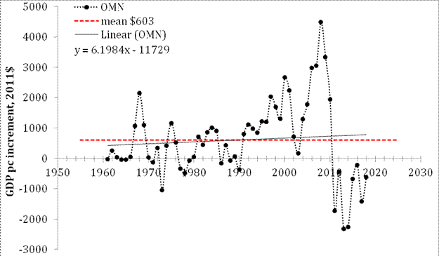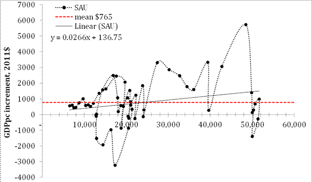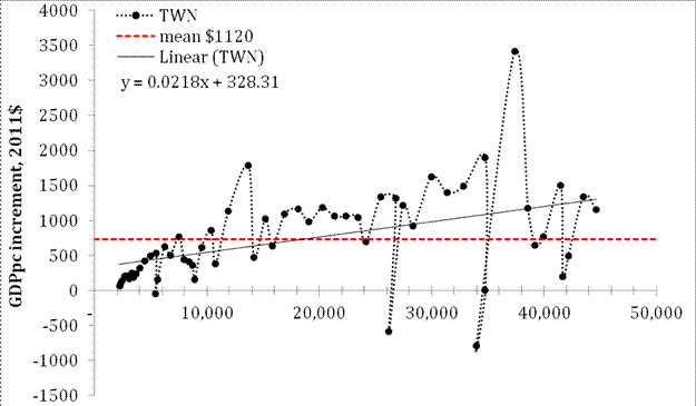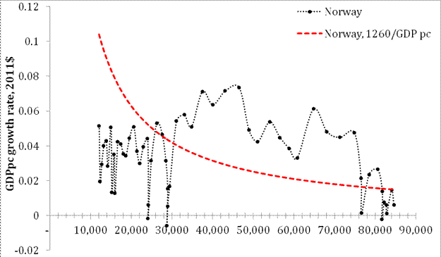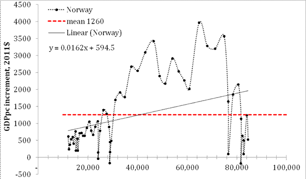Figure 1. Norway. The upper panel: the annual GDPpc increment between 1961 and 2018 with the average value for the studied period of $1260 (2011 prices). The middle panel: the same annual increment as a function of GDPpc level. The lower panel: the relative growth rate of the GDPpc as a function of the GDPpc.