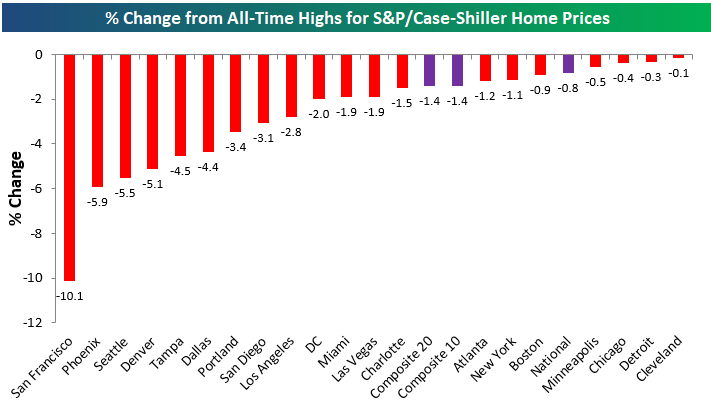 A year or so ago, nearly every city tracked by Case Shiller was sitting at record highs, but now there's not one city that hasn't seen at least a small drop from all-time highs.
