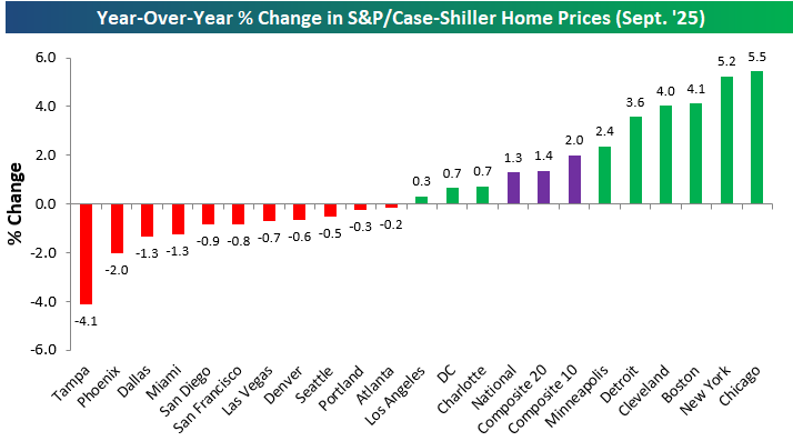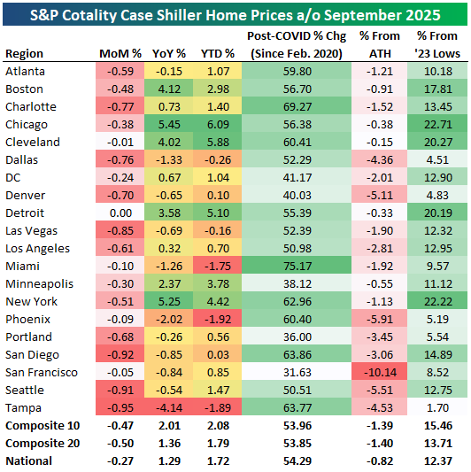 Home price data from S&P Cotality for September was posted this week and showed that not one of the twenty cities tracked by Case Shiller saw a month-over-month gain. Tampa, Seattle, and San Diego saw the biggest monthly drops, while Detroit and Cleveland were down the least.