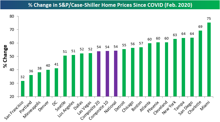 The cities where home prices are up the least versus February 2020 levels are San Francisco, Portland, Minneapolis, Denver, and DC, but even these cities are still up more than 30%.