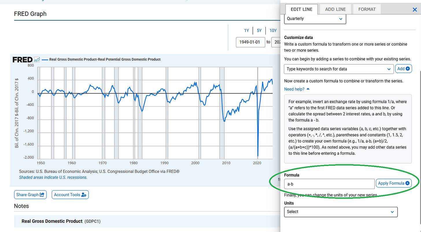 FRED’s graph builder lets you create a custom series to calculate the output gap (Real GDP – Real Potential GDP). Here’s how: