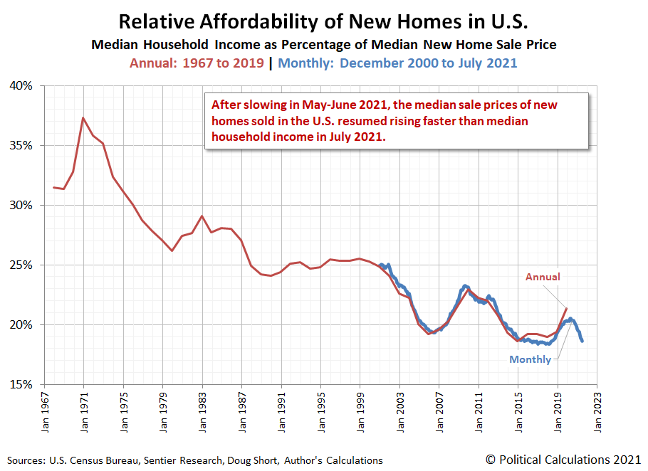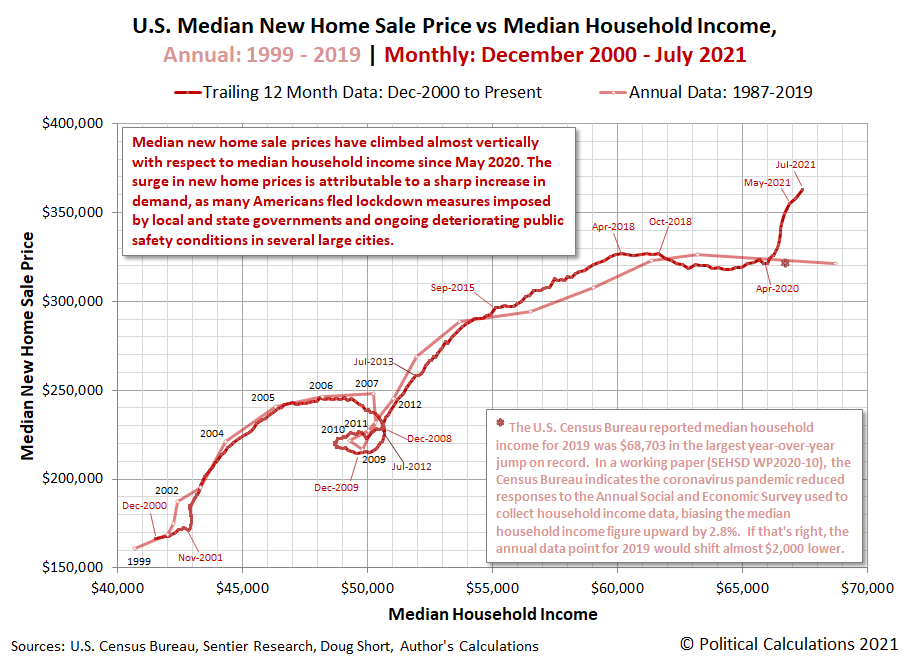 After a year's hiatus with the coronavirus pandemic, median household income began noticeably rising in May 2021. But median new home sale prices are continually rising faster. The following chart shows the newly developing trend in the relationship between median new home sale prices and median household income.