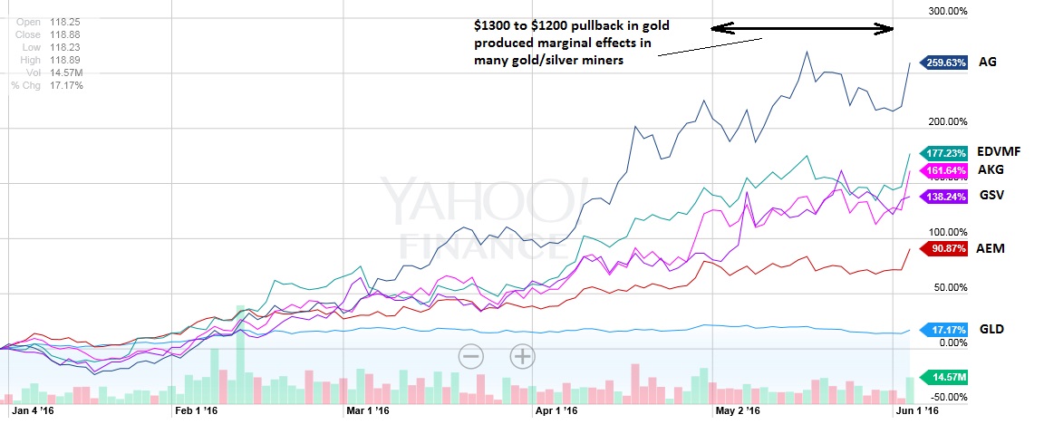 As this chart shows, over the month of May, we saw a $100 move down in gold, but trying to trade a gold miner portfolio around this would have been very dicey. So if we go another $50 down to the $1150 level, will that trading turn out any better? Maybe, who knows. The miners, especially South Africans, led the turn at the start of the year, and they seem to be strongly leading now. It may be advisable to just watch gold's behavior on this bounce off MAPS, and if it clearly weakens below it, maybe take some profits here and there.