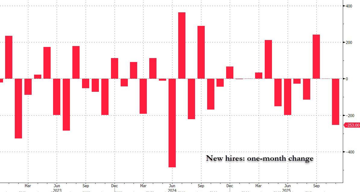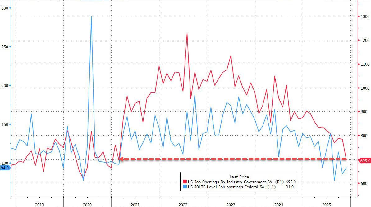 Putting it all together, despite a rather solid ADP print earlier, today's JOLTS report was quite terrible and certainly enough to ensure that Fed rate cuts continue (assuming no dramatic improvement in Friday's job report). The flip side, of course, is that this report took place when the government was still mostly shut down, so our advice would be to just ignore everything since it is not indicative of the current state of the US economy after it reopened shortly after Democrats captiulated without achieving anything.