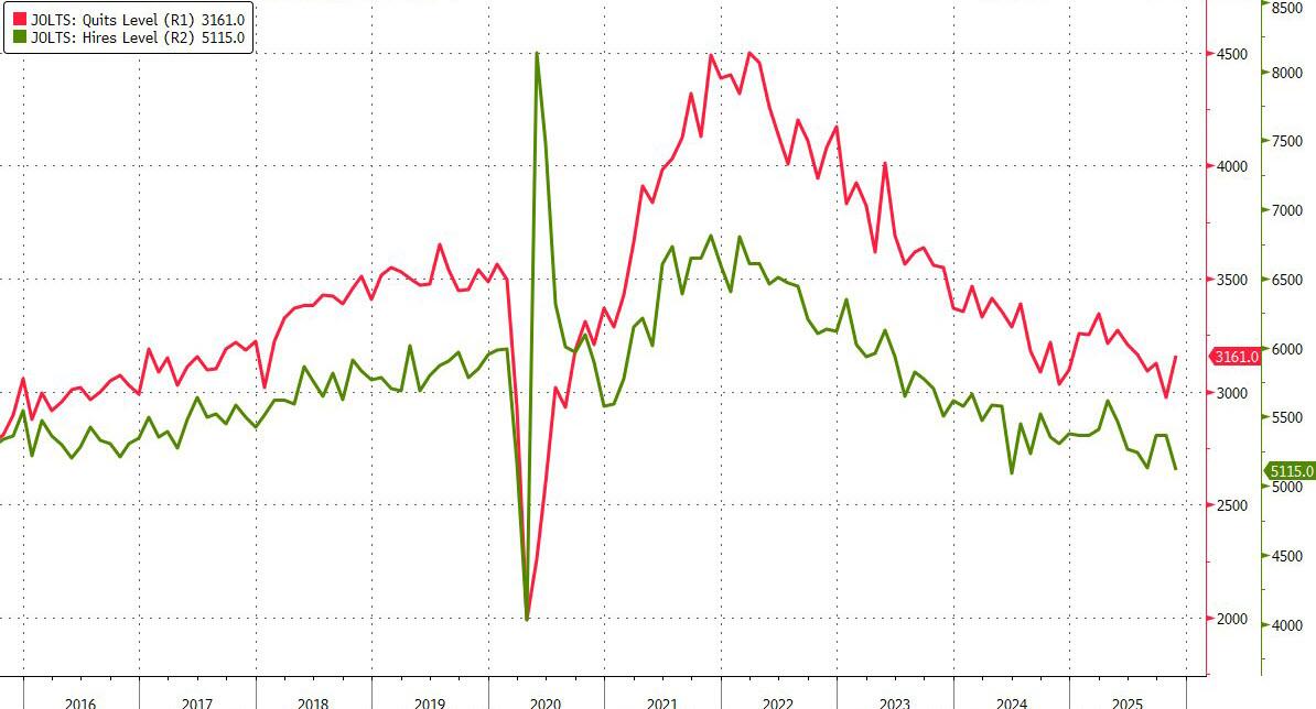 While the job openings data was ugly and potentially another harbinger of the coming jobs recession - things were even uglier below the surface, as the number of new hires tumbled by 253K - the biggest one month drrop since June 2024 - to 5.1156MM the lowest since June 2024.
