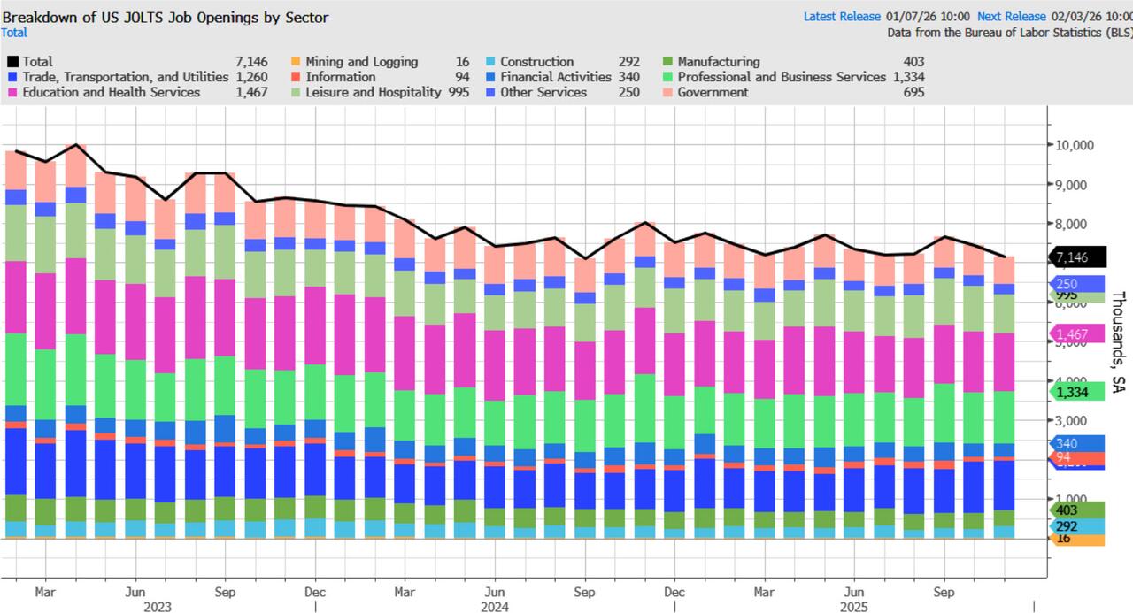 While today's ADP report was a solid rebound from the worst monthly report in years (even if it missed expectations due to a sudden plunge in California payrolls), the same could not be said for the JOLTS job opening report that followed less than two hours later, and which was another epic disaster: for the month of November (recall JOLTS lags the payrolls report by a month), the US had only 7.146 million job openings, a huge drop from the 7.670 million in October (which was conveniently revised lower to 7.449 million) and the lowest since September 2024.