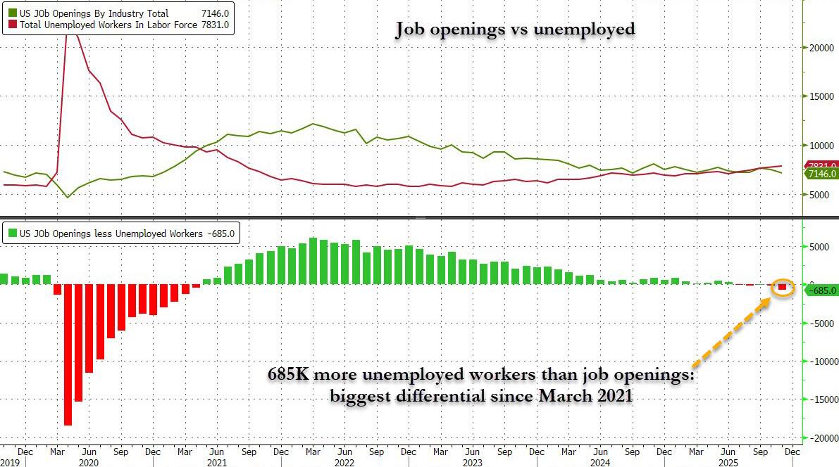 Meanwhile, after four years of the US labor market dodging the bullet, its luck has finally run out because while until just a few months ago, the labor market was supply-constrained, with more job openings than unemployed workers in the US, in November we are finally back to sharply demand constrained, with 685k fewer job openings than unemployed workers, the most since March 2021...