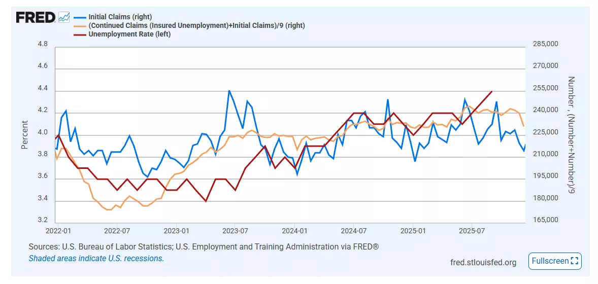 It is also possible that this is a reaction to the anomaly last year in the unemployment rate, which was put down (rightly I think) to a miscalculation of the impact of immigration on the population numbers. But this year all the evidence is that has reversed. The answer apparently lies in the 0.6 million surge in the unemployment level as well as a 1.2 million surge in the civilian labor force calculation in the Household Survey since July, especially in comparison with very low increases calculated last November. I suspect we are going to have to wait for January for YoY comparisons to be more valid, since they will not be against the big immigration undercount of 2024. Since that undercount does not affect jobless claims numbers, at very least we have to take the alleged triggering of the “Sahm Rule” in November’s jobs report with extra grains of salt.