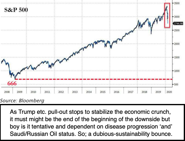 Concurrently believing the 'all is well, live life as usual', as polyannish or denial, we thought all that was necessary in February was to watch South Korea or then Italy, to see how well limited containment efforts worked, of course unfortunately not well. Why should anyone believe that a Friendly Fed or fiscal stimulus would do much, even if they helped stabilize some aspects; short of a crush on small businesses, which are in big trouble.