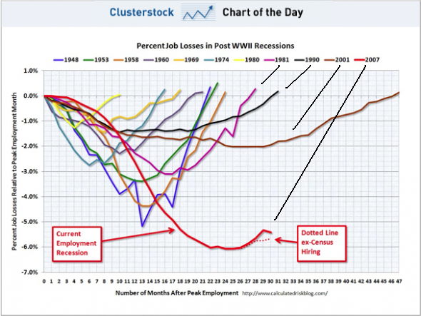 This chart shows that there seems to be some growing problem with each subsequent employment recovery that slows it down from what a normal downturn and recovery in the economy should look like.What has been growing in recent decades with regard to economic downturns?I'll give you three hints - "F" "E" "D" - and its middle initial is Federal Reserve Board.