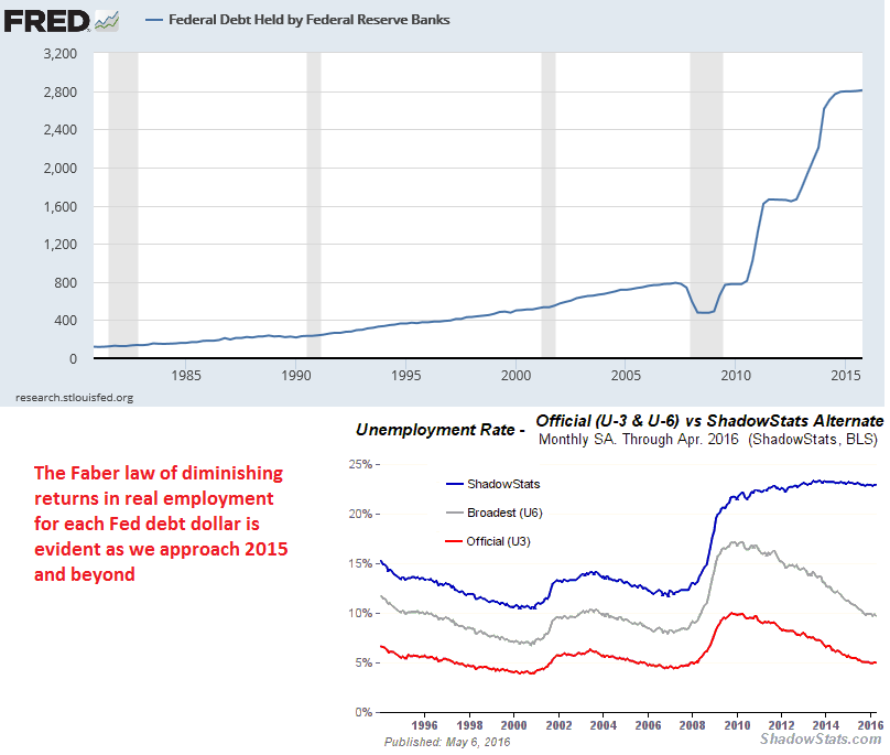 This Marc Faber chart formulated 15 years ago shows the diminishing positive effect of each debt dollar on GDP growth.Clear back then, he projected "zero hour" - when piling on new monetary debt gets us nothing but pathetic real economic growth. This was projected to come at around the year 2015. Fifteen years ago, few could find fault with the wonderful help from the Fed's activity.Here in 2015ville the feeling is quite different.This out-of-control debt dynamic is nothing new in history. A fascinating article over at Zerohedge points out the math of debt creation vs the math of economic growth and how previous civilizations have had to deal with this diminishing return on debt path.We may be approaching such a point now in America.