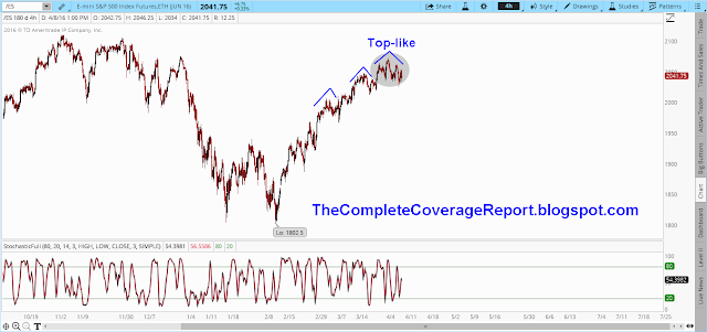 Technically, since we are still in an uptrend, there is the possibility of a final short-squeeze to higher highs. Anything upward of 20, even 50 points would theoretically take the S&P into May for a top. The result would be a divergent peak, indicating the rally is a bad one. It would also be the best scenario for the bulls - as price would form an even larger top, providing enough time for everyone to get out.In any case, whether we drop immediately, or continue on, the coming decline should lead to a 2-4 week sell off.