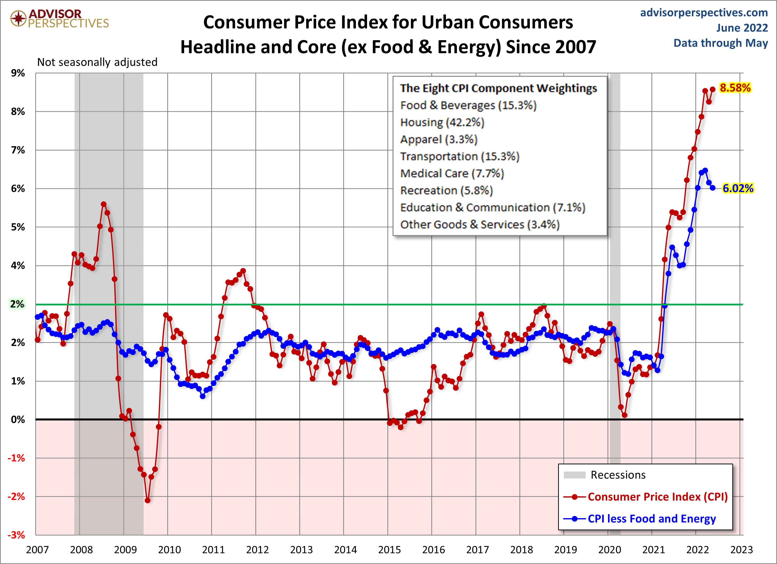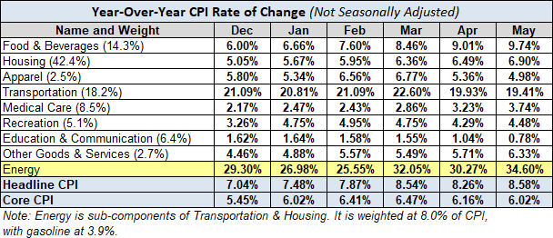 We can make some inferences about how inflation is impacting our personal expenses depending on our relative exposure to the individual components. Some of us have higher transportation costs, others medical costs, etc.